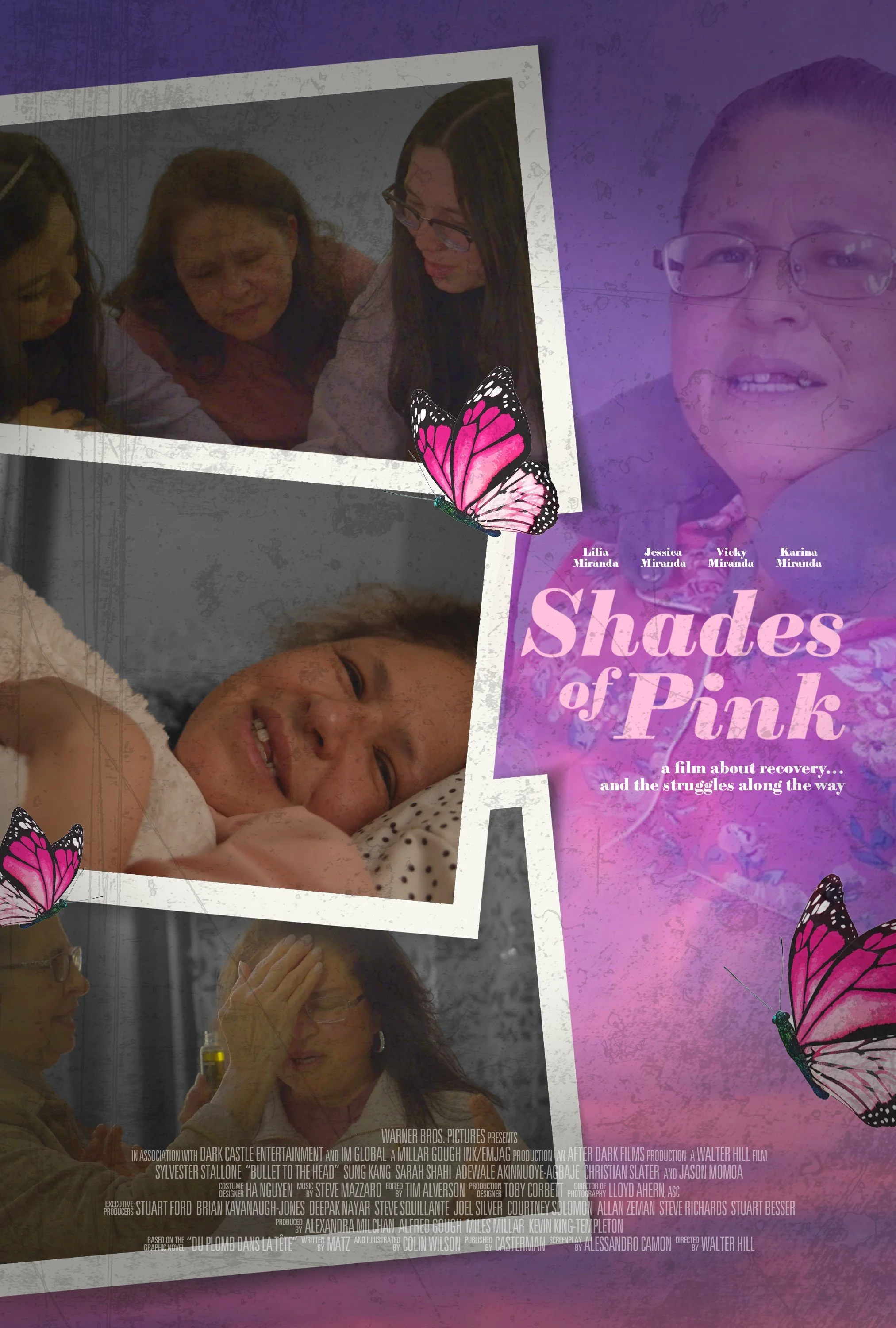Shades of Pink (2023) Movie Poster Design - I wanted to depict a soft, emotional aesthetic, blending documentary-style photography with a heartfelt, personal touch. The background features a gradient of purple and pink hues, representing the shades of pink. The title is written in an elegant pink cursive font to evoke warmth and emotion. Throughout the poster, scattered monarch butterflies symbolize transformation and hope. The photographs capture various moments from the film, including a mother and her daughters engaged in a heartfelt conversation, a smiling mother recovering in bed, and a moment of prayer—emphasizing themes of family, support, and perseverance. The overall design conveys warmth, struggle, and resilience.