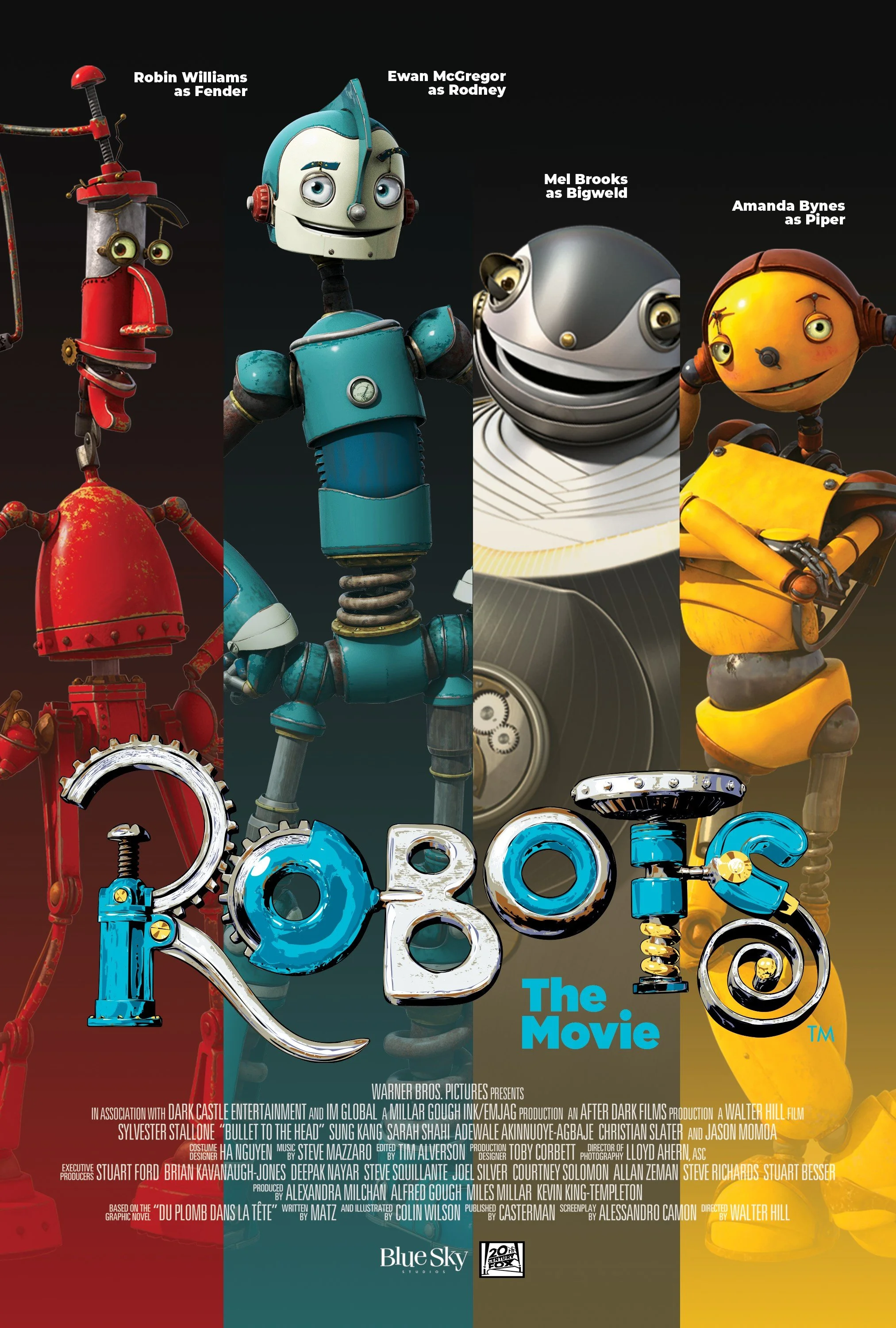 Robots (2005) Movie Poster Redesign - Compared to the original 2005 poster, I took a simpler approach by minimizing background colors and focusing solely on the characters and their distinct color schemes while retaining the iconic Robots title.